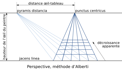 Alberti a donné une belle méthode de construction de la décroissance de la profondeur apparente des carreaux lorsque l’on s’éloigne de la ligne de terre, en perspective.